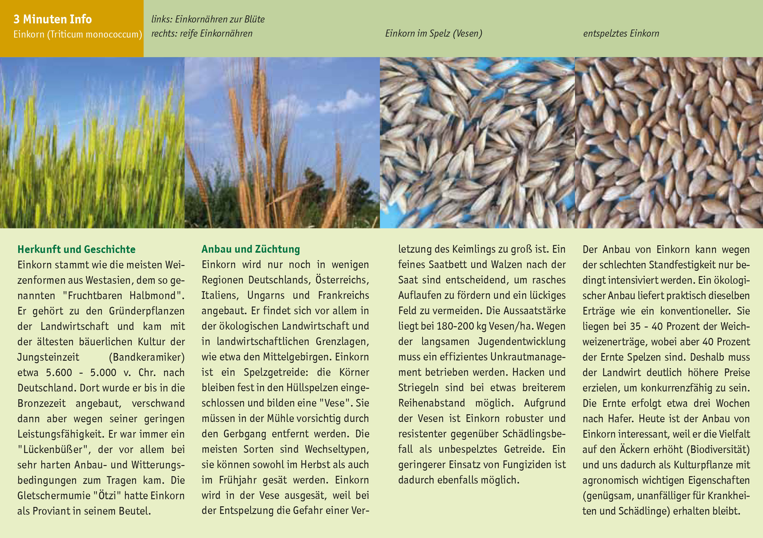 Einkorn ist eine ursprüngliche Weizenform und gehört zur Familie der Süßgräser (Poaceae). Die Pflanze wird bis zu 1,4 Meter hoch. Die zierliche hellgrüne Ähre besitzt einkörnige Ährchen, daher der Name.