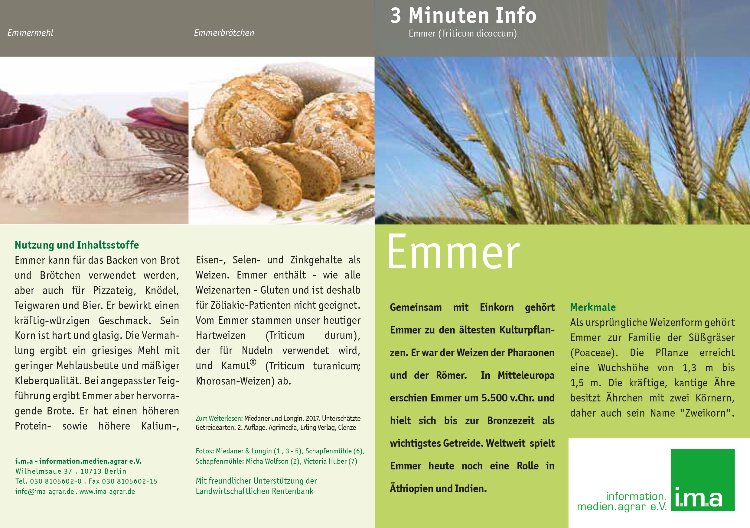 Gemeinsam mit Einkorn gehört Emmer zu den ältesten Kulturpflanzen. Er war der Weizen der Pharaonen und der Römer. In Mitteleuropa erschien Emmer um 5.500 v. Chr. und hielt sich bis zur Bronzezeit als wichtigstes Getreide. Weltweit spielt Emmer heute noch eine Rolle in Äthiopien und Indien.
