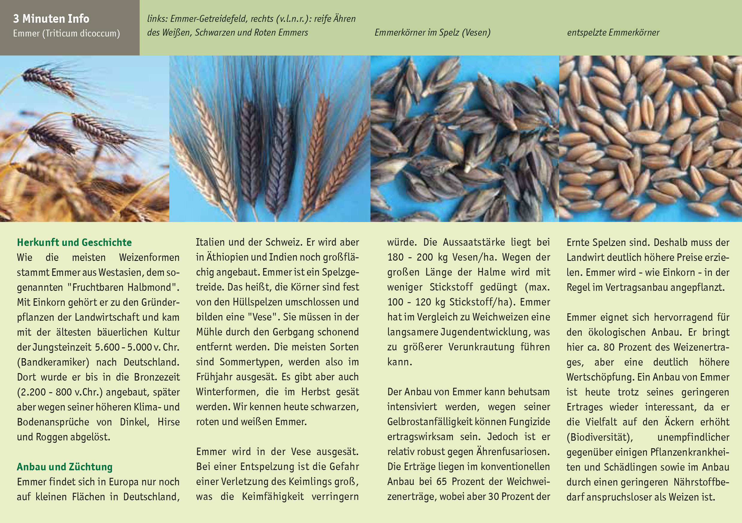 Emmer findet sich in Europa nur noch auf kleinen Flächen in Deutschland, Italien und der Schweiz. Er wird aber in Äthiopien und Indien noch großflächig angebaut. Emmer ist ein Spelzgetreide. Das heißt, die Körner sind fest von den Hüllspelzen umschlossen und bilden eine "Vese". Sie müssen in der Mühle durch den Gerbgang schonend entfernt werden. Die meisten Sorten sind Sommertypen, werden also im Frühjahr ausgesät. Es gibt aber auch Winterformen, die im Herbst gesät werden. Wir kennen heute schwarzen, roten und weißen Emmer. Emmer wird in der Vese ausgesät. Bei einer Entspelzung ist die Gefahr einer Verletzung des Keimlings groß, was die Keimfähigkeit verringern würde. Die Aussaatstärke liegt bei 180–200 kg Vesen/ha. Wegen der großen Länge der Halme wird mit weniger Stickstoff gedüngt (max. 100–120 kg Stickstoff/ha). Emmer hat im Vergleich zu Weichweizen eine langsamere Jugendentwicklung, was zu größerer Verunkrautung führen kann. Der Anbau von Emmer kann behutsam intensiviert werden, wegen seiner Gelbrostanfälligkeit können Fungizide ertragswirksam sein. Jedoch ist er relativ robust gegen Ährenfusariosen. Die Erträge liegen im konventionellen Anbau bei 65 Prozent der Weichweizenerträge, wobei aber 30 Prozent der Ernte Spelzen sind. Deshalb muss der Landwirt deutlich höhere Preise erzielen. Emmer wird – wie Einkorn – in der Regel im Vertragsanbau angepflanzt. Emmer eignet sich hervorragend für den ökologischen Anbau. Er bringt hier ca. 80 Prozent des Weizenertrages, aber eine deutlich höhere Wertschöpfung. Ein Anbau von Emmer ist heute trotz seines geringeren Ertrages wieder interessant, da er die Vielfalt auf den Äckern erhöht (Biodiversität), unempfindlicher gegenüber einigen Pflanzenkrankheiten und Schädlingen sowie im Anbau durch einen geringeren Nährstoffbedarf anspruchsloser als Weizen ist.
