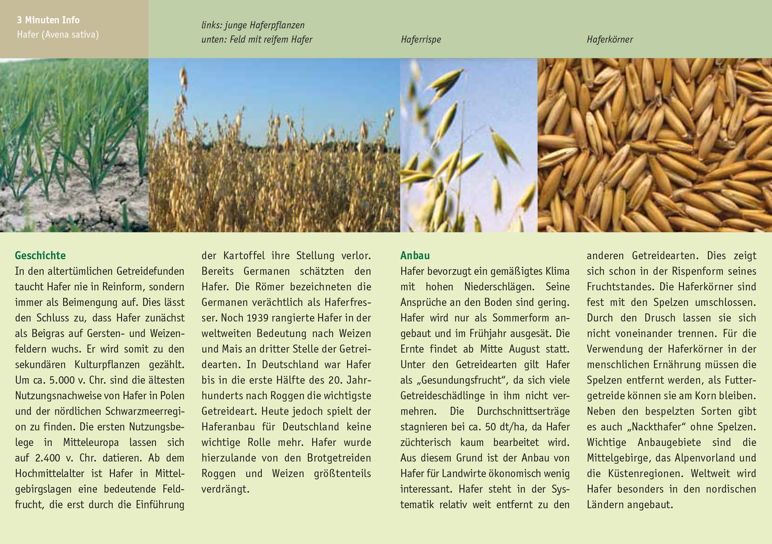 Hafer bevorzugt ein gemäßigtes Klima mit hohen Niederschlägen. Seine Ansprüche an den Boden sind gering. Hafer wird nur als Sommerform angebaut und im Frühjahr ausgesät. Die Ernte findet ab Mitte August statt. Unter den Getreidearten gilt Hafer als „Gesundungsfrucht“, da sich viele Getreideschädlinge in ihm nicht vermehren. Die Durchschnittserträge stagnieren bei ca. 50 dt/ha, da Hafer züchterisch kaum bearbeitet wird. Aus diesem Grund ist der Anbau von Hafer für Landwirte ökonomisch wenig interessant. Hafer steht in der Systematik relativ weit entfernt zu den anderen Getreidearten. Dies zeigt sich schon in der Rispenform seines Fruchtstandes. Die Haferkörner sind fest mit den Spelzen umschlossen. Durch den Drusch lassen sie sich nicht voneinander trennen. Für die Verwendung der Haferkörner in der menschlichen Ernährung müssen die Spelzen entfernt werden, als Futtergetreide können sie am Korn bleiben. Neben den bespelzten Sorten gibt es auch „Nackthafer“ ohne Spelzen. Wichtige Anbaugebiete sind die Mittelgebirge, das Alpenvorland und die Küstenregionen. Weltweit wird Hafer besonders in den nordischen Ländern angebaut.